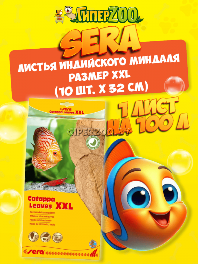 SERA Catappa Leaves - листья индийского миндаля для подготовки воды природным способом. Sera листья Catappa позволяют подготовить воду, сделав её по характеристикам как в природных биотопах. Листья индийского миндаля (Catappa) поддерживают естественное поведение, а также готовность декоративных рыб и креветок к нересту. Кроме того, они предотвращают бактериальные и грибковые инфекции. Благодаря своим вяжущим свойствам, они помогают процессу заживления после травм. Креветки, ракообразные и сомы с готовностью принимают листья индийского миндаля в качестве дополнительного корма. Применение: Листья погрузятся в воду в течение 24 - 48 часов. Совет: Благодаря предварительному ошпариванию они погрузятся в воду сразу же и легче усваиваются в качестве корма. Действующие вещества высвобождаются в течение 2 - 3 недель.