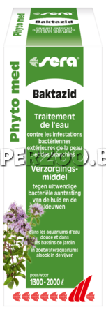 SERA Кондиционер воды Phyto med Baktazid 100 мл - Растительное кондиционер воды против внешними бактериальными инфекциями на коже и жабрах. Растительное кондиционер воды sera Phyto med Бактацид в качестве действующего вещества для борьбы с бактериальными покраснениями кожи, вызванных бактериями Aeromonas, Pseudomonas или Vibrio, а также плавниковой и жаберной гнилью у декоративных рыб в пресноводных аквариумах и садовых прудах содержит высокоэффективное тимьяновое масло, полученное из Thymus vulgaris L., Thymus zygis L. Диагностика внешней бактериальной инфекции может быть проведена путем микроскопического исследования мазков с кожи или жабр. sera Phyto med Бактацид отличается высокой эффективностью и хорошо переносится как рыбами, подвергаемыми обработке, так и улитками и другими беспозвоночными.