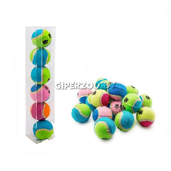 Игрушка для собак в виде теннисного мяча с рисунком. Изготовлена из прочной цветной резины с ворсистой поверхностью. Предназначена для игр с собакой любого возраста.