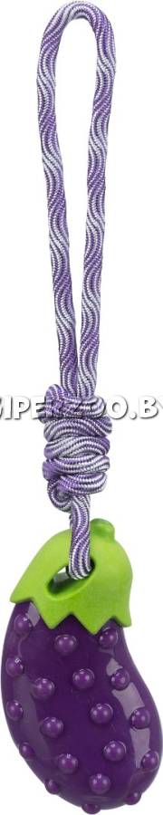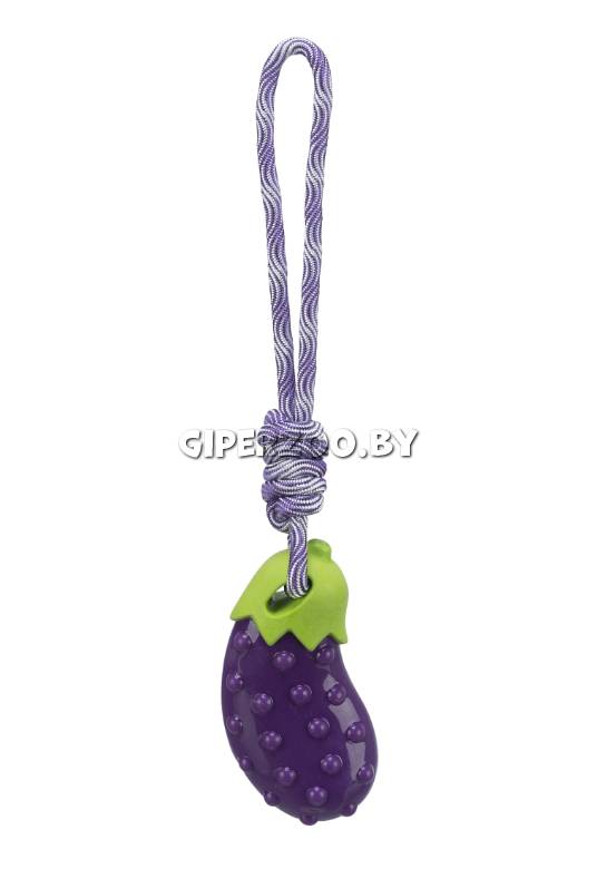 Эта игрушка TRIXIE с артикулом 34707 предназначена для собак всех пород и сделана из термопластичной резины (TPR) и полиэфира. Она имеет форму баклажана, прикрепленного к веревке, и издает звук при нажатии.