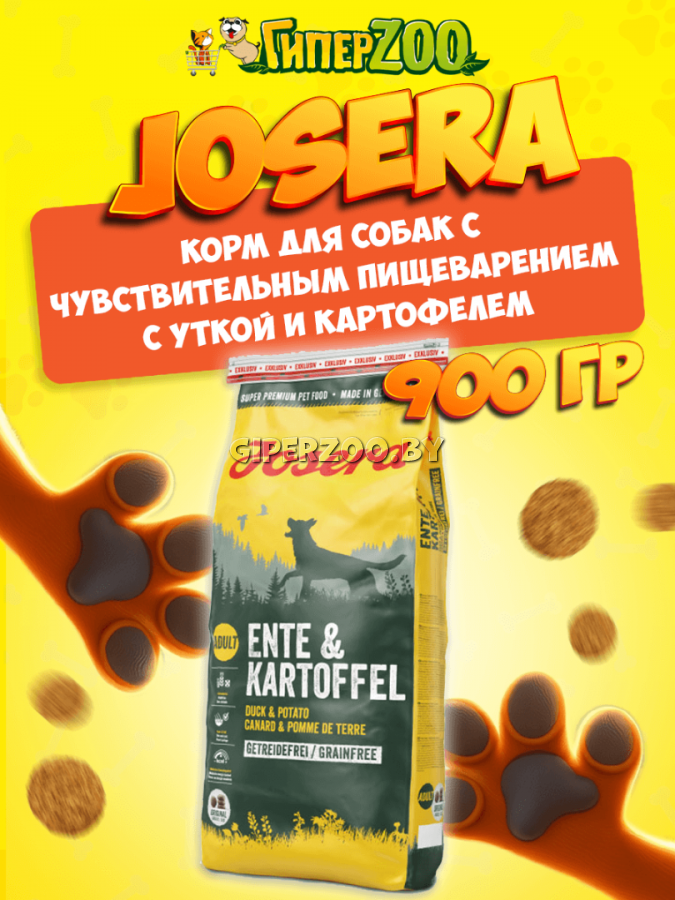 Josera Ente & Kartoffel (утка), 0,9 кг - беззерновой рацион для взрослых собак с чувствительным пищеварением с уткой и картофелем.