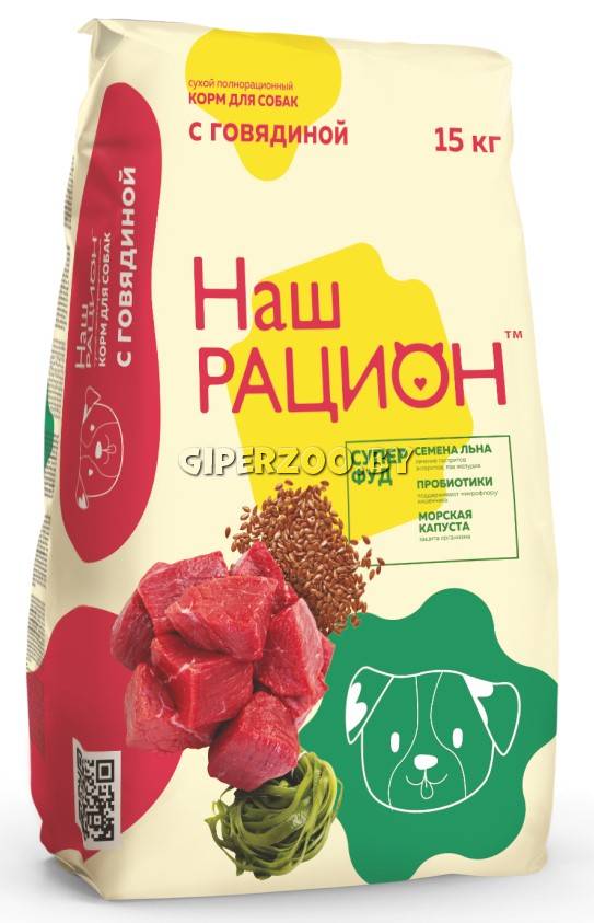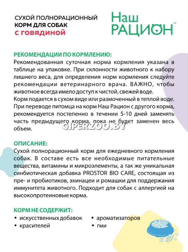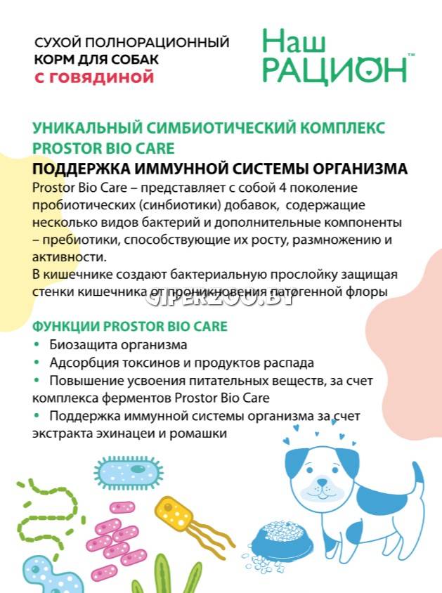 Сухой корм для собак Наш Рацион с говядиной обеспечивает организм питомца всеми питательными веществами, витаминами, микроэлементами. В состав входит уникальная симбиотическая добавка Pro Bio Care, состоящая из пребиотиков и пробиотиков, эхинацеи и ромашки.