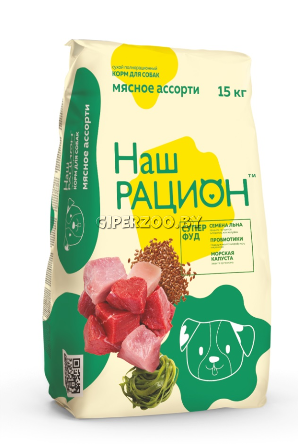 "Наш рацион" Adult (мясное ассорти), 15 кг - сухой корм для собак, обеспечивает организм питомца всеми питательными веществами, витаминами, микроэлементами.