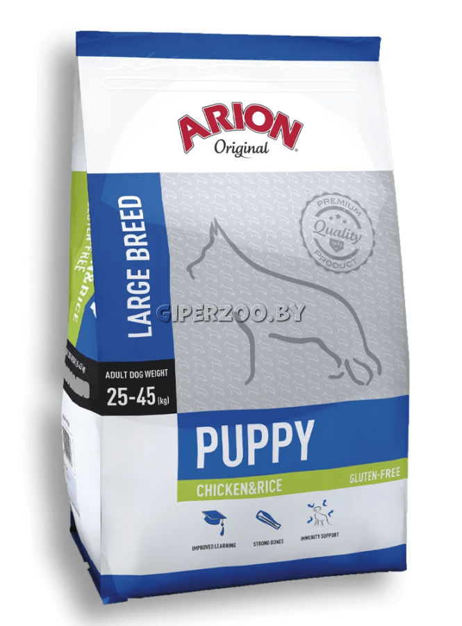 ARION Original Puppy Large Breed (цыплёнок с рисом), 12 кг - сухой безглютеновый корм. Содержит компоненты для поддержки суставов, укрепляющие его опорно-двигательный аппарат.Состав: С цыпленком (30%), рисом (30%), животным жиром, сушеным картофелем, горохом, гидролизованным животным белком, свекольным жомом, минералами, сухими пивными дрожжами, рафинированной целлюлозой, рыбьим жиром, коллагеном, глюкозамином, хондроитинсульфатом, M.O.S. ФОС, бета-глюканы, растительные экстракты (Rosmarinus sp., Vitis sp., Curcuma sp., Citrus sp., Eugenia sp.).ARION Original не содержит глютена, рецепты не содержат пшеницу, рожь или ячмень. Наши ингредиенты приобретаются без ГМО, и не добавляются ненужные добавки, такие как ароматизаторы и красители.•Жирные кислоты омега-3 для поддержки способности к обучению у щенков.•Рыбий жир, сушеный лосось, цинк и биотин способствуют здоровью кожи и шерсти.•Экстракты растений и витамины укрепляют хрупкую иммунную систему вашего щенка.