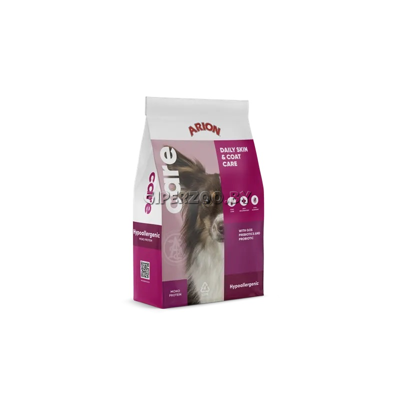 ARION CARE Hypoallergenic (лосось), 12 кг - корм для собак для профилактики аллергии. Разработан для улучшения и поддержания состояния кожи и шерсти вашей собаки. Собаки с чувствительной кожей могут получить пользу от этого корма, состоящего из легко усваиваемых ингредиентов с пониженным уровнем аллергенов.Состав: С вяленым лососем, рисом, сушеным картофелем, животным жиром, горохом, гидролизованным лососем, свекольным жомом, гидролизованным животным белком, минеральными веществами, сухими пивными дрожжами, картофельным белком, рыбьим жиром, G.O.S. (500 ppm), МОС, ФОС, ß-глюканы, растительные экстракты (Rosmarinus sp., Curcuma sp., Citrus sp., Eugenia sp.).Профилактическая забота с вкусными блюдами из нашей линейки ARION Care — это простой и эффективный способ укрепить здоровье вашего четвероногого друга.•УХОД ЗА ШЕРСТЬЮ •ОМЕГА 3 •ГИПОАЛЛЕРГЕННЫЙ