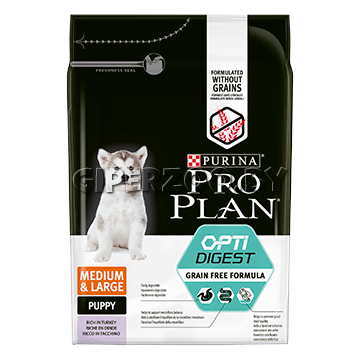 Pro Plan Puppy Medium & Large Opti Digest Grain Free (Индейка) - это полноценный и сбалансированный корм для домашних животных, специально разработанный для щенков (взрослый вес> 10 кг) с чувствительным пищеварением.