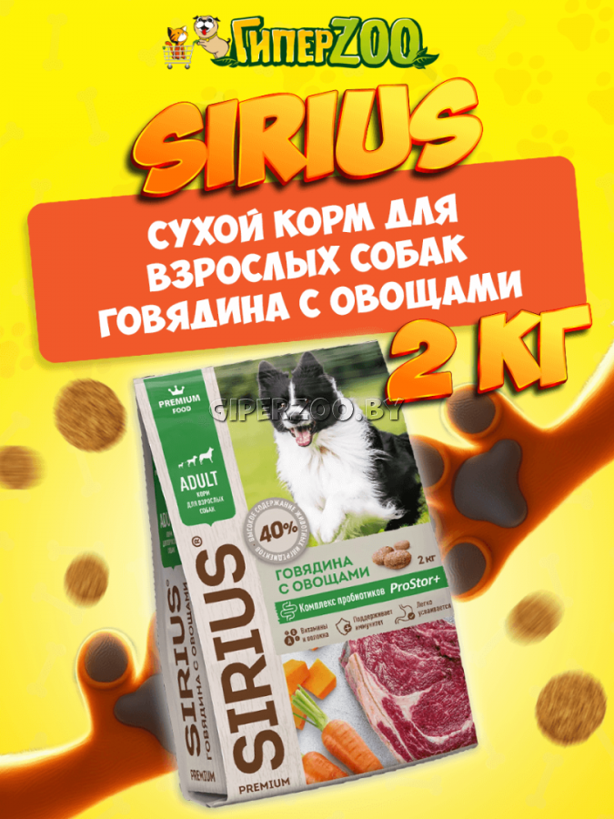 SIRIUS Adult (Говядина с овощами), 2 кг - сухой корм премиум класса для полноценного ежедневного рациона взрослых собак.