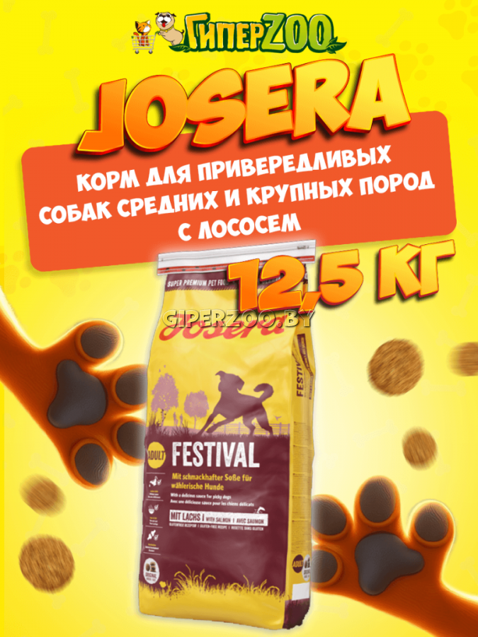 Josera Festival для взрослых собак всех пород привередливых в еде, 12,5 кгFestival это высококачественный, хорошо сбалансированный корм для взрослых собак. Аппетитная рецептура на основе лосося, риса и домашней птицы. Корм можно употреблять как в сухом виде, так и с добавлением теплой воды: при этом глазурь превращается во вкуснейший соус.