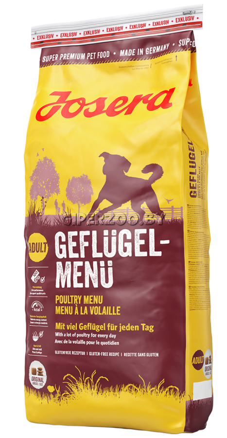 Josera Poultry Menu для взрослых собак,15 кгJosera Poultry Menu Корм — ассорти из домашней птицы для взрослых собакСбалансированный рацион для взрослых активных собак. Он хорошо усваивается и не перегружает желудок. Питание легкое, содержит мясо домашней птицы без пшеницы и сои. В состав включены жирные кислоты, медь, цинк и витамины, которые заботятся о коже и блестящей шерсти.