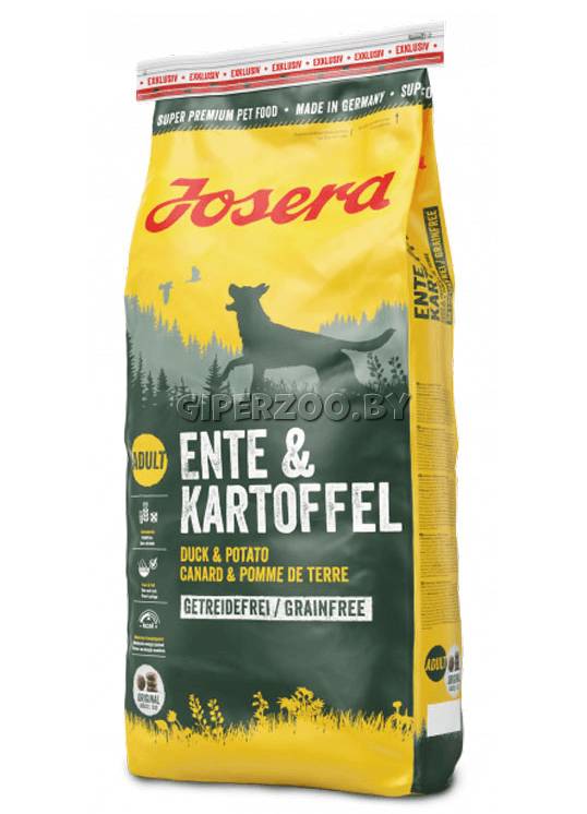JOSERA ENTE & KARTOFFEL(28/16) – беззерновой, монопротеиновый рацион для взрослых собак с чувствительным пищеварением с уткой и картофелем. - 25% сухого мяса утки (равного 85 г свежего мяса на 100 г сухого корма) - изготовлен из наилучших натуральных ингредиентов - мяса утки и картофеля, не содержит зерновых, сои и других видов белка. Подходит для собак с чувствительным пищеварением -содержит оптимальный баланс Омега 3 и Омега 6 ненасыщенных жирных кислот, витамин Е, биотин, цинк и медь в легко усваиваемой органической форме, обеспечивающих здоровье кожи и шерсти -идеальное соотношение кальция, фосфора и витамина С способствует укреплению общего здоровья и поддержанию здорового скелета - высокое содержание антиоксидантов предотвращает воздействие на организм свободных радикалов, замедляя процессы старения - содержит корень цикория - природный источник пребиотика инулина, который благоприятно влияет на рост полезной микрофлоры кишечника, улучшает пищеварение -содержание дрожжей в ко