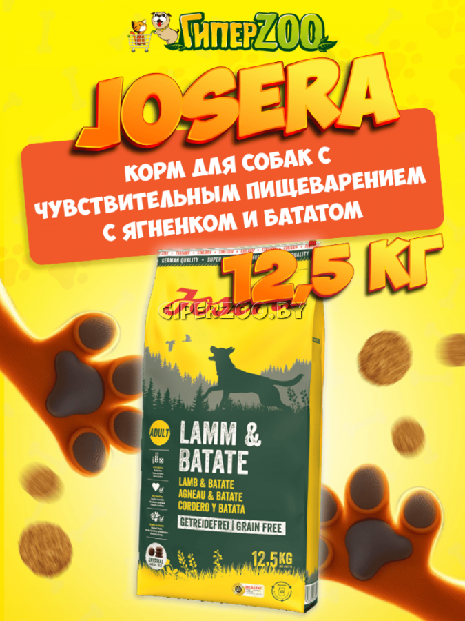 беззерновой, монопротеиновый рацион для взрослых собак с чувствительным пищеварением, с ягненком, бататом, травами и фруктами. -содержит 25% сухого мяса ягненка (равного 85 г свежего мяса на 100 г сухого продукта) -основой для корма служит ягненок (в качестве единственного источника животного белка), батат, травы и фрукты, благодаря чему использование корма позволяет улучшить пищеварение и обеспечить организм энергией и необходимыми питательными веществами -содержание белка и минералов снижено для уменьшения нагрузки на почки и предотвращения набора лишнего веса, поэтому рацион может быть использован как для взрослых собак, так и для пожилых животных -в составе корма отсутствуют зерновые, благодаря чему рацион отлично подходит для собак с чувствительным пищеварением и аллергией на глютен -корень цикория является источником пребиотика инулина, который благоприятно влияет на рост полезной микрофлоры в кишечнике, а вместе с добавлением дрожжей и яблочной клетчатки комплексно поддерживает пищеварительную систему