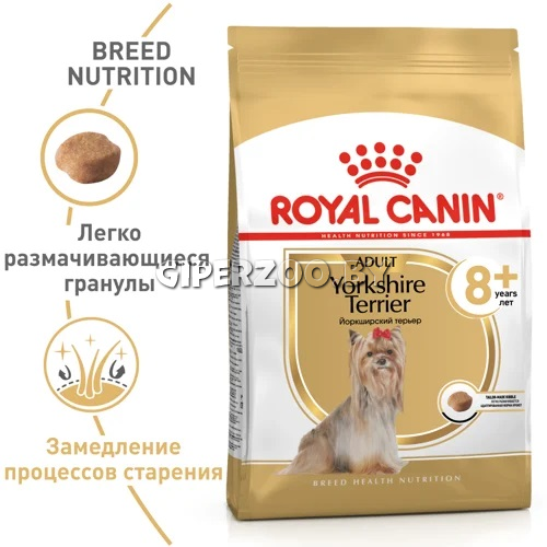 Royal Canin Yorkshire 8+ 0.5 кг - разработан для поддержания здоровья в старости. Эксклюзивный комплекс антиоксидантов помогает сохранить здоровье клеток, а оптимальное содержание фосфора способствует поддержанию здоровья почек стареющих собак.