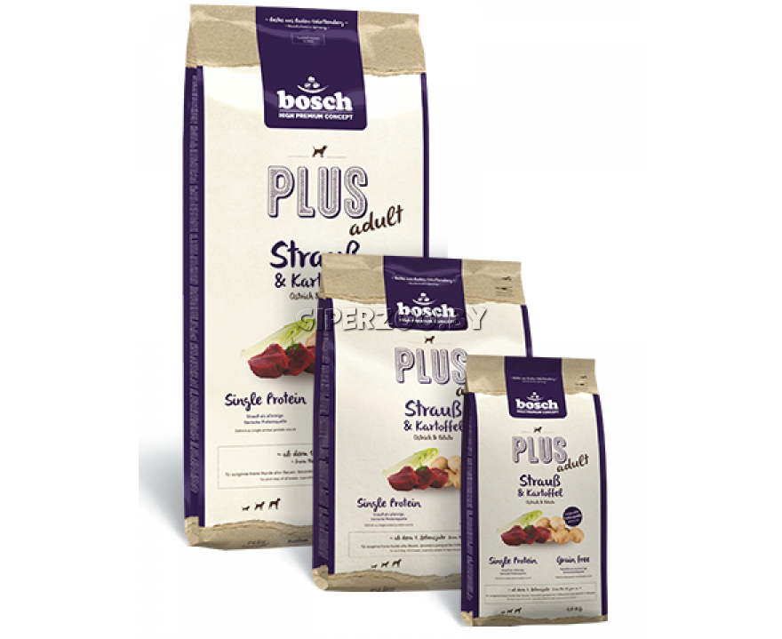 Bosch Plus Adult (Страус и картофель) - это однокомпонентный беззерновой белковый продукт для сбалансированного и здорового питания взрослых собак.