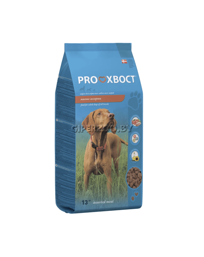 Proхвост «Мясное ассорти», 500 гр – это полнорационный сбалансированный сухой корм для собак. Рацион подходит для ежедневного кормления взрослых собак всех пород. Сухой корм Proхвост (Прохвост) для собак – это превосходный вкус, который нравится домашним питомцам за счет высокого содержания белка животного происхождения.