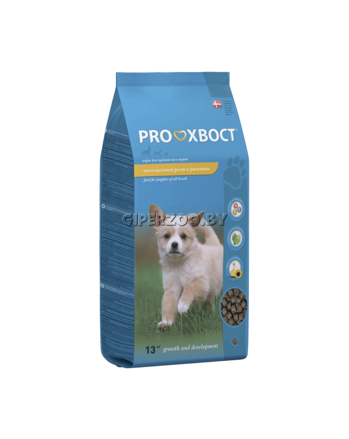 ProХвост для щенков, 13 кг - полнорационный сбалансированный сухой корм для щенков всех пород, начиная с 2–х месяцев. Подходит для кормления беременных и кормящих собак. Корм Proхвост (Прохвост) разработан на основе европейских исследований в области питания домашних животных.