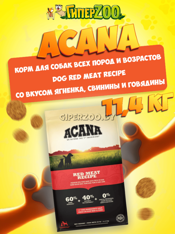 Рацион современных собак не только подобен рациону их предков, но и необходим им для отменного здоровья. Переполненная мясными ингредиентами, формула ACANA Classic Red содержит непревзойденные ингредиенты из красного мяса, включая мясо бычков породы «Ангус», поросят породы «Йоркшир» и мясо ягнят, выращенных на «свободном выгуле». Эти ингредиенты доставляются ежедневно СВЕЖИМИ или СЫРЫМИ в соотношении WholePrey для полноценного питания Вашей собаки. Корма ACANA подходят для собак всех пород и размеров. Как и вы сами, ваша собака — яркая индивидуальность, поэтому нормы кормления должны рассчитываться исходя из породы, условий содержания, возраста и активности.