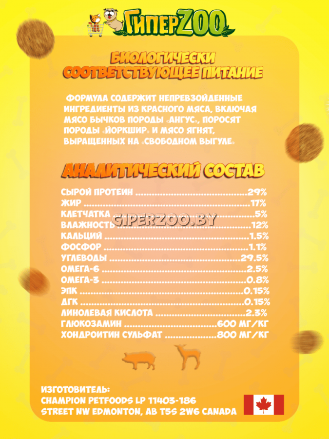 Рацион современных собак не только подобен рациону их предков, но и необходим им для отменного здоровья. Переполненная мясными ингредиентами, формула ACANA Classic Red содержит непревзойденные ингредиенты из красного мяса, включая мясо бычков породы «Ангус», поросят породы «Йоркшир» и мясо ягнят, выращенных на «свободном выгуле». Эти ингредиенты доставляются ежедневно СВЕЖИМИ или СЫРЫМИ в соотношении WholePrey для полноценного питания Вашей собаки. Корма ACANA подходят для собак всех пород и размеров. Как и вы сами, ваша собака — яркая индивидуальность, поэтому нормы кормления должны рассчитываться исходя из породы, условий содержания, возраста и активности.