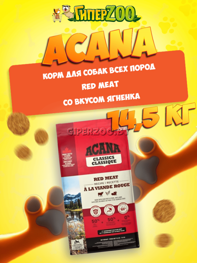 Рацион современных собак не только подобен рациону их предков, но и необходим им для отменного здоровья. Переполненная мясными ингредиентами, формула АКАНА Классик Ред содержит непревзойденные ингредиенты из красного мяса, включая мясо бычков породы «Ангус», поросят породы «Йоркшир» и мясо ягнят, выращенных на «свободном выгуле». Эти ингредиенты доставляются ежедневно СВЕЖИМИ или СЫРЫМИ в соотношении WholePrey™ для полноценного питания Вашей собаки.