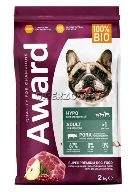 Award Hypo Adult All breeds (Свинина) – сухой корм для взрослых собак всех пород со свининой с добавлением брусники, груши и розмарина.