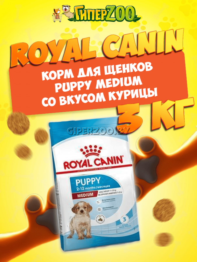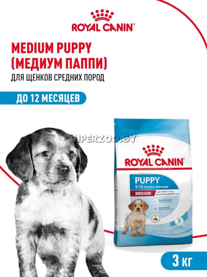 Royal Canin Puppy Medium, 3 кг - разработан для щенков средних пород (вес взрослой собаки от 11 до 25 кг) в возрасте от 2 до 12 месяцев.