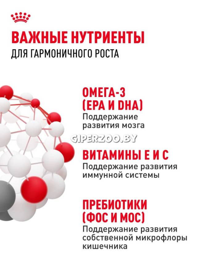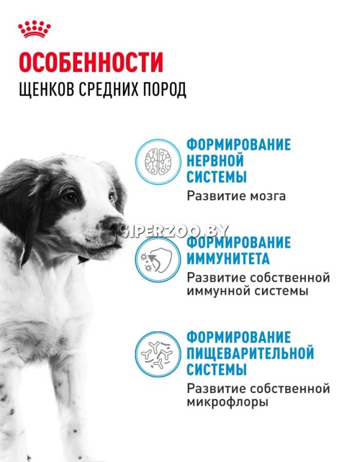 Благодаря высокому содержанию белков Royal Canin Medium Puppy поддерживает гармоничное развитие щенка, рост его костей и мышц в течение относительно короткой фазы роста.