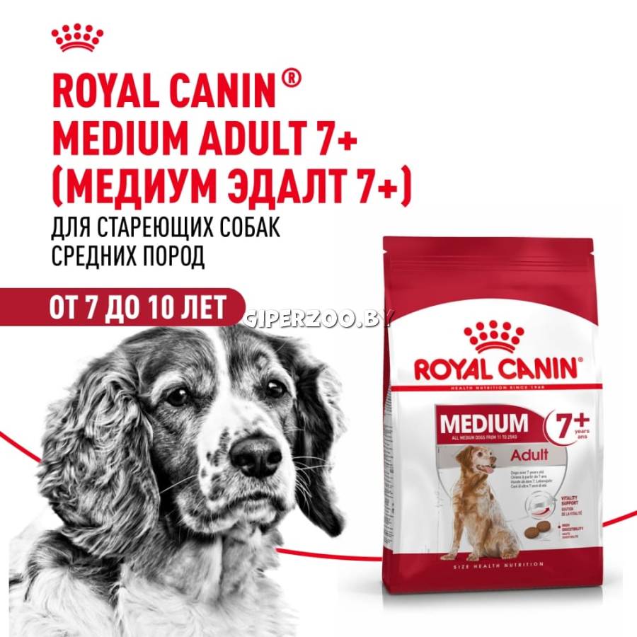 Royal Canin Medium Adult 7+, 15 кг - корм сухой полнорационный для взрослых собак средних размеров (весом от 11 до 25 кг) в возрасте 7 лет и старше.