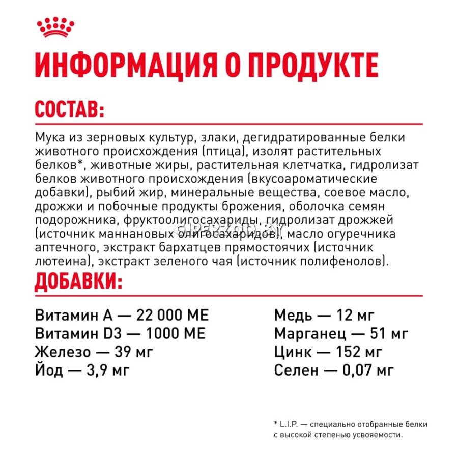 мука из зерновых культур, злаки, дегидратированные белки животного происхождения (птица), изолят растительных белков*, животные жиры, растительная клетчатка, гидролизат белков животного происхождения (вкусоароматические добавки), рыбий жир, минеральные вещества, соевое масло, дрожжи и побочные продукты брожения, оболочка и семена подорожника, фруктоолигосахариды, гидролизат дрожжей (источник мaннановых олигосахаридов), масло огуречника аптечного, экстракт бархатцев прямостоячих (источник лютеина), экстракт зеленого чая (источник полифенолов).