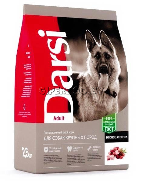 Darsi Adult (Мясное ассорти) - это полнорационный сухой корм для взрослых собак крупных пород. Ингредиенты в составе сухого корма Darsi «Мясное ассорти» для собак крупных пород. Мясо — ингредиент №1. Мясная мука (в том числе телятина) — полноценный источник белка. Мясной протеин с полноценным аминокислотным составом обеспечивает поддержку мышц. Специальная технология приготовления улучшает усвояемость, снижает нагрузку на ЖКТ. Цельнозерновая пшеница, богатая питательными веществами и клетчаткой, улучшает стул и поддерживает здоровое пищеварение. Печень отличается высоким содержанием железа и витамина А, а также витаминов группы В, фосфора и магния. Масло кукурузное положительно влияет на ЖКТ, служит источником энергии и предупреждает воспалительные процессы в организме. Комплекс витаминов и минералов (А, В4, Д3, Е, В3, С, В1, В5, В2, В6, В9, К3, В7, В12, калий, железо, цинк, марганец, медь, йод, селен) делает шерсть и кожу здоровой, поддерживает остроту зрения и обеспечивает энергией.