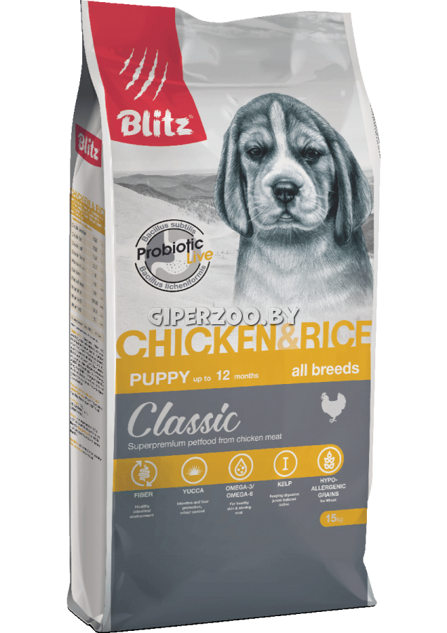 Blitz Classic Chicken & Rice Puppy (курица, рис), 15 кг - полнорационный сухой корм для щенков можно назвать универсальным: он рассчитан на малышей и юниоров всех пород и размеров (до 12 мес.).