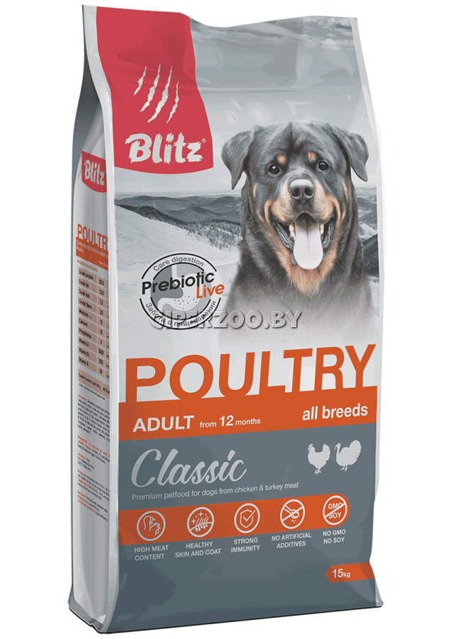 Blitz Classic Poultry Adult (птица), 15 кг - этот полнорационный корм для взрослых собак содержит высококачественное мясо курицы и индейки, которое является отличным источником полноценного животного белка.