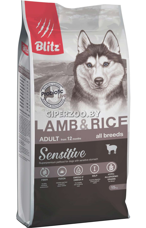 Blitz Sensitive Lamb & Rice Adult (ягненок, рис), 15 кг - комплексный сухой корм, с ягнёнком и рисом, создан для взрослых собак всех пород, которые по тем или иным причинам обладают чувствительным пищеварением, не переносят частотные животные белки (курицу или говядину) и склонны к пищевым аллергиям.