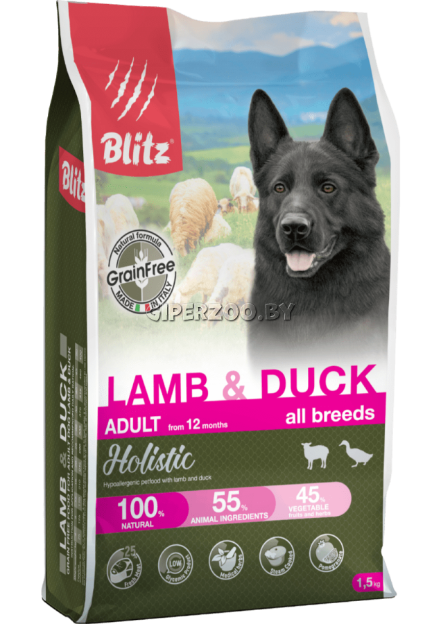 Blitz Holistic Lamb & Duck Adult, 1,5 кг - беззерновой сухой корм для взрослых собак всех пород создан на основе ягнёнка и утки — самых низкоаллергенных видов мяса.