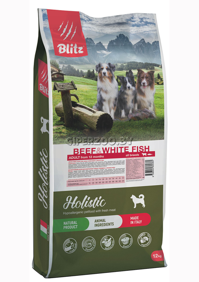 Blitz Holistic Beef & White Fish Adult, 12 кг - сухой беззерновой корм в сочетании ингредиентов из красного мяса говядины и белой рыбы.