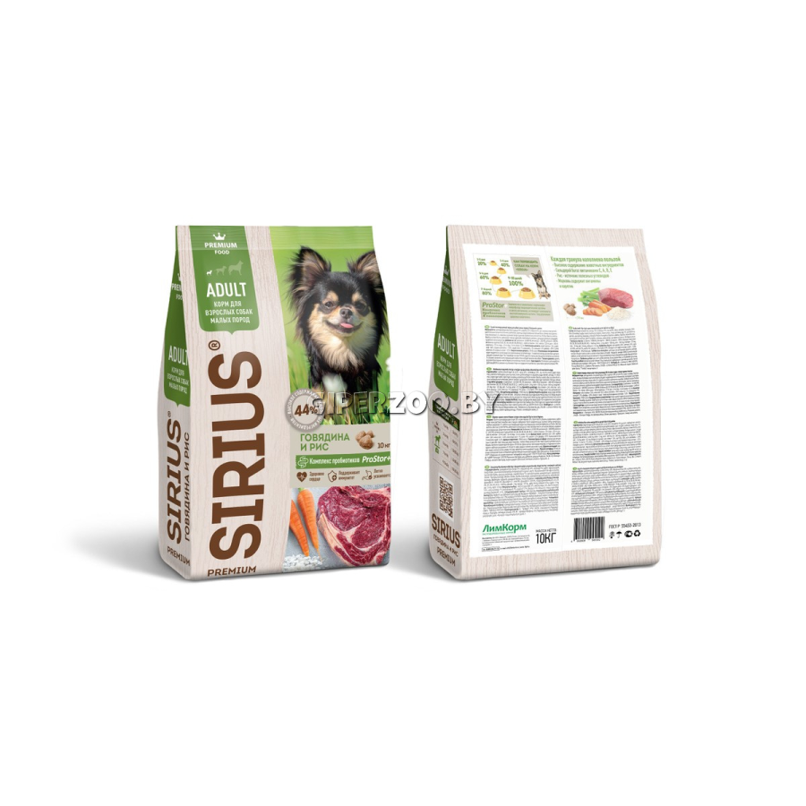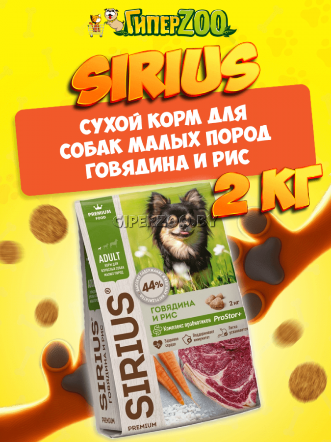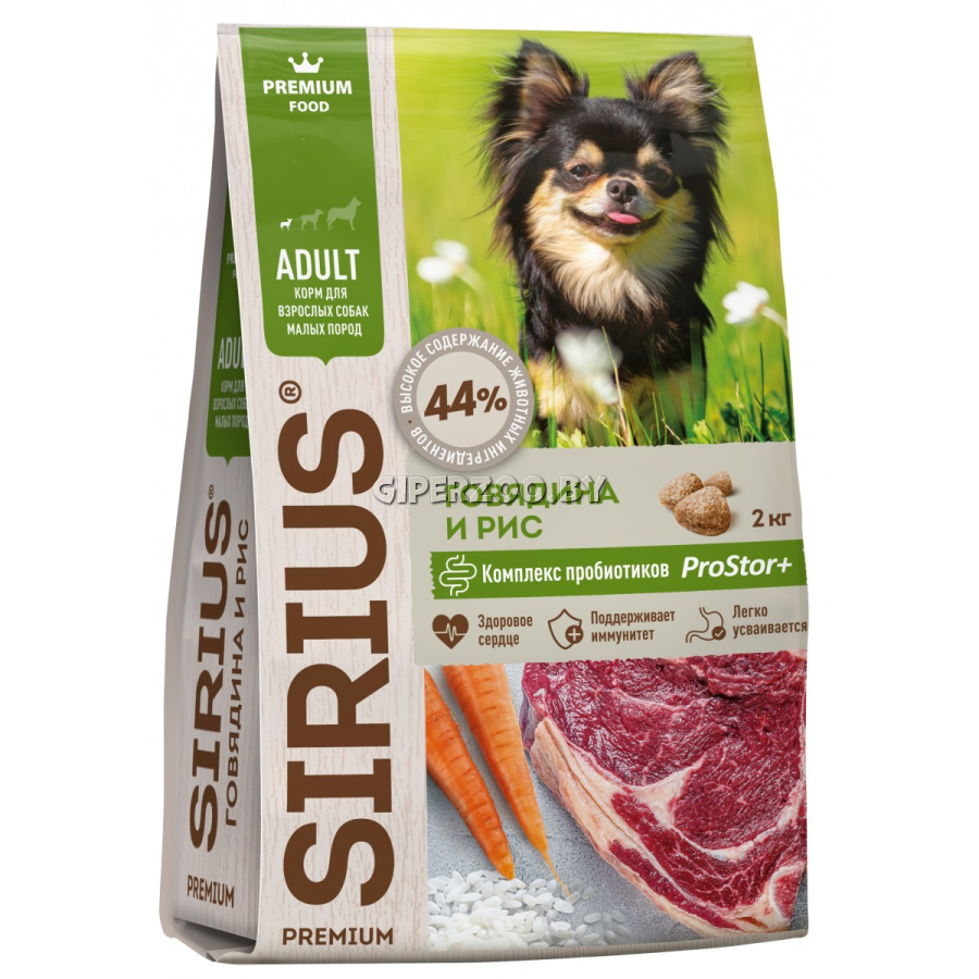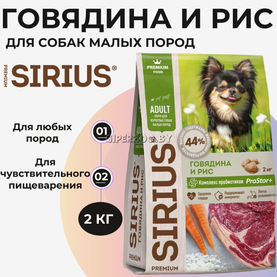 SIRIUS для собак мал. пород (говядина, рис), 2 кг – сухой корм премиум класса для взрослых собак малых пород. SIRIUS — сухой корм премиум класса для полноценного ежедневного рациона взрослых собак малых пород. Высокое содержание мясных ингредиентов обеспечивает оптимальный уровень белка и укрепляет мышцы.