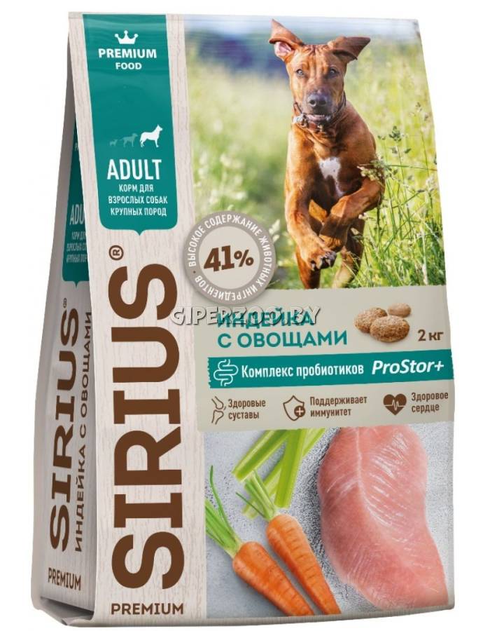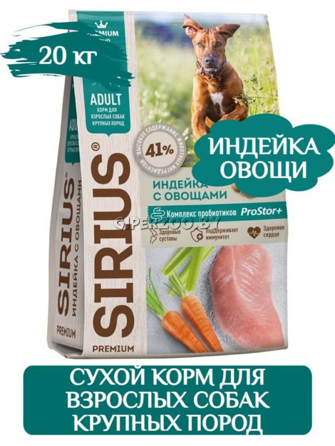 SIRIUS для взрослых собак крупных пород (Индейка, овощи), 20 кг – сухой корм премиум класса для полноценного ежедневного рациона взрослых собак крупных пород.