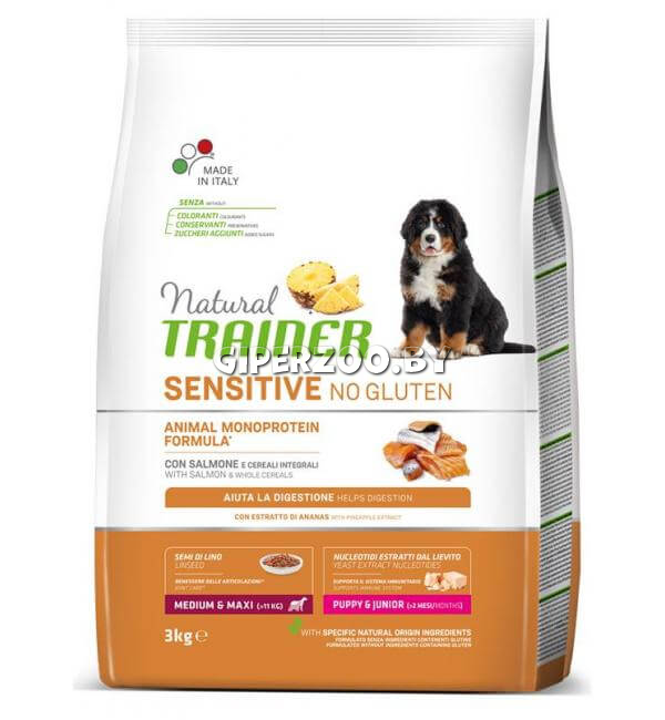 Сухой корм Trainer Natural Sensitive No Gluten Medium&Maxi Puppy&Junior (Лосось) 12 кг - это полноценный и сбалансированный корм для щенков средних и крупных пород с чувствительным пищеварением.