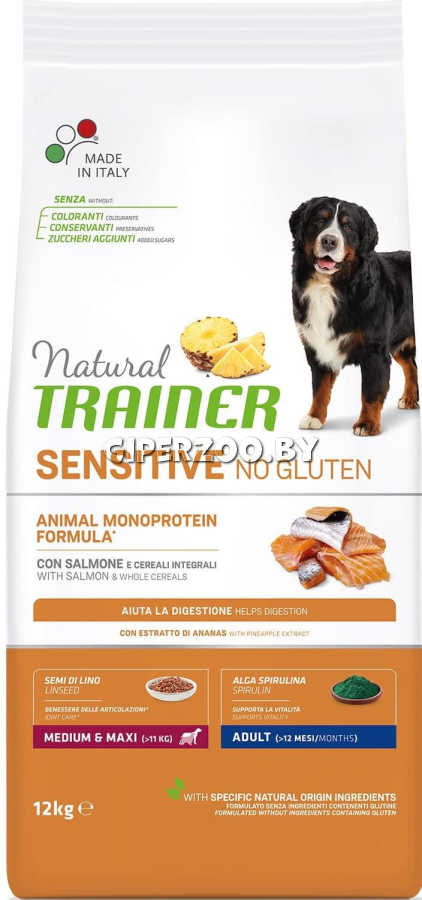 Сухой корм Trainer Natural Sensitive No Gluten Medium&Maxi Adult (Лосось) - это полноценный и сбалансированный корм для взрослых собак средних и крупных пород с чувствительным пищеварением.