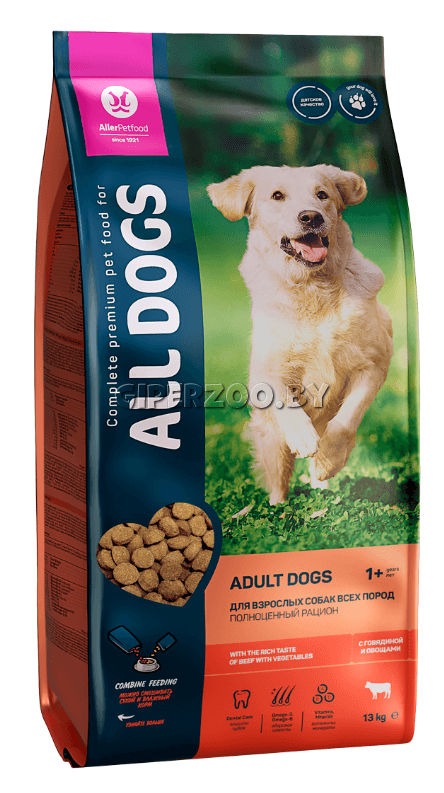 ALL DOGS для собак (говядина и овощи), 13 кг - это полноценный премиальный корм для собак всех пород. Он разработан на основе результатов последних исследований в области питания домашних животных, а также с учетом международных стандартов (AAFCO/FEDIAF).