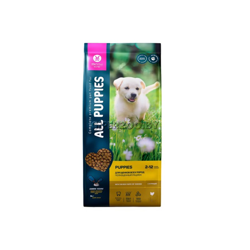 ALL PUPPIES для щенков (курица), 13 кг - это полнорационный премиальный корм для щенков всех пород, а также для беременных и кормящих собак. Он разработан на основе результатов последних исследований в области питания домашних животных, а также с учетом международных стандартов(AAFCO/FEDIAF).