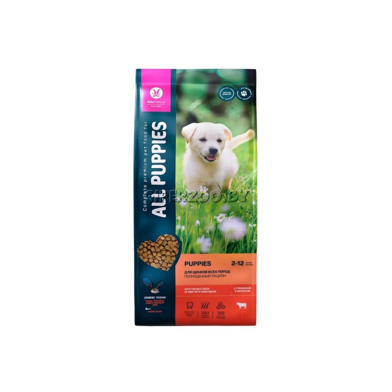 ALL PUPPIES для щенков (говядина), 13 кг - это полнорационный премиальный корм для щенков всех пород, а также для беременных и кормящих собак. Он разработан на основе результатов последних исследований в области питания домашних животных, а также с учетом международных стандартов(AAFCO/FEDIAF).