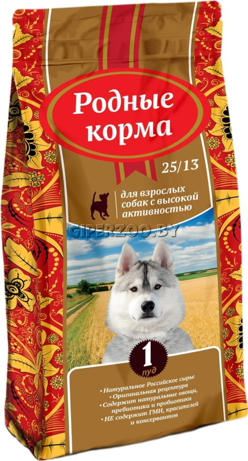 Сухой корм для собак РОДНЫЕ КОРМА Adult Sport 25/13 16,38 кг ‒ полнорационный сухой корм для взрослых собак с повышенной активностью. Для полноценной жизни собакам с высокой активностью требуется сбалансированное питание, которое будет включать в себя необходимые жиры, белки, углеводы, а также витамины и минеральные вещества. В производстве сухого корма используются только натуральные продукты, произведенные на территории РФ, а также оригинальная российская рецептура с массой полезных добавок (фрукты и овощи, а также пребиотики и пробиотики), лекарственные травы придают продукту особую биологическую ценность и обеспечивают высокую эффективность применения. В корм входит уникальный для существующих на рынке кормов препарат ПроСтор. ПроСтор разработан совместно с Институтом экологии и эволюции им. А. Н. Северцова РАН.ПроСтор — кормовая синбиотическая добавка нового поколения, обеспечивающая биозащиту организма, повышение продуктивности животных за счет улучшения конверсии корма, стимуляции обме