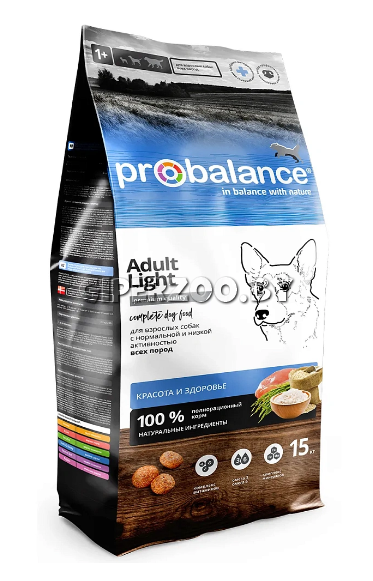 Корм Probalance Adult Light разработан датскими ветеринарами. Баланс питательных веществ способствует снижению веса у собак с массой тела выше нормы и помогает поддерживать идеальный вес у собак с нормальной или низкой активностью.