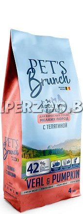 Сухой корм Pet's Brunch для собак мелких пород (телятина), 11 кг (Пэтс Бранч) - полнорационный корм с мясом телятины и тыквой для взрослых собак мелких пород, который содержит оптимальное соотношение протеинов и углеводов, а также необходимое количество аминокислот, витаминов и минералов.