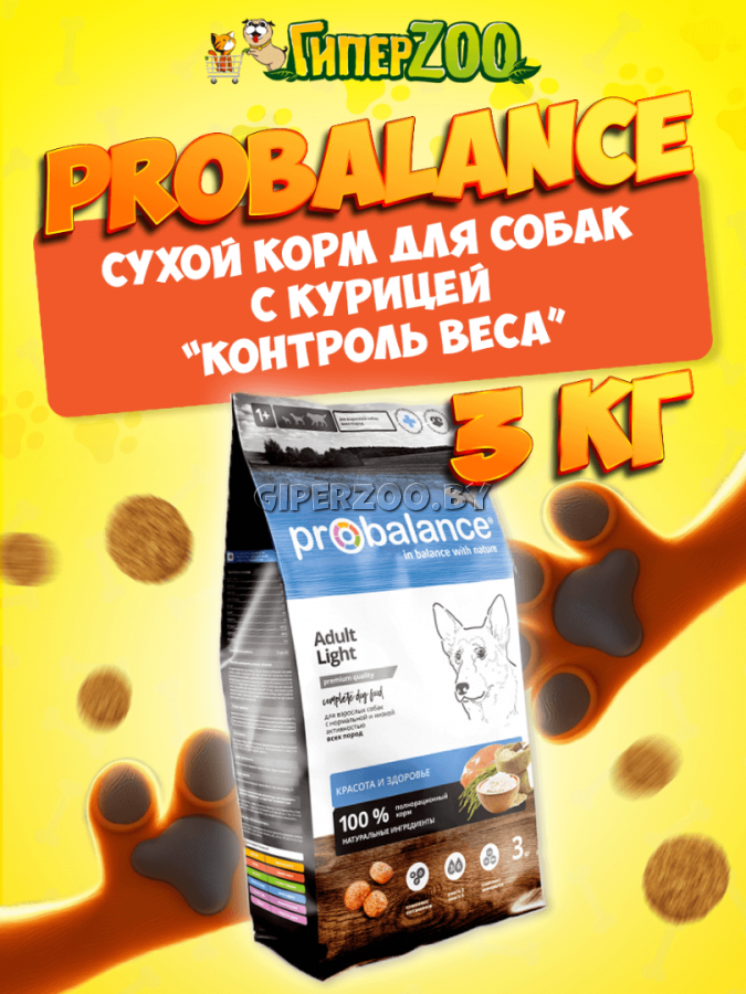 ProBalance Immuno Adult Light, 3 кг - предназначен для ежедневного кормления взрослых собак всех пород с нормальной и низкой активностью. Баланс питательных веществ корма способствует снижению веса у собак с массой тела выше нормы и поддержанию оптимального вес у собак с нормальной или низкой активностью. Высокое содержание белка помогает поддерживать мышечную массу. Несколько видов натуральных пищевых волокон стимулируют пищеварение и способствуют здоровью кишечника. L-карнитин улучшает транспорт жирных кислот в митохондрии, тем самым стимулирует сжигание жиров в организме. Глюкозамин и хондротин помогают сохранить суставы здоровыми. Комплекс натуральных антиоксидантов защищает клетки организма от вредных продуктов окисления.