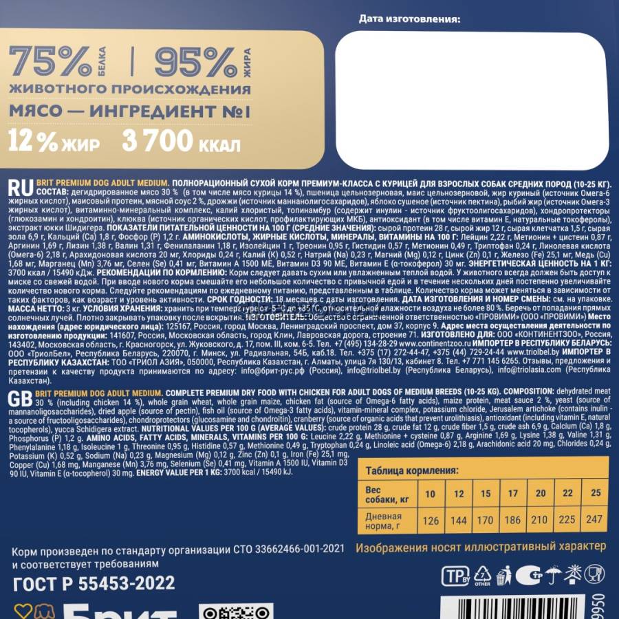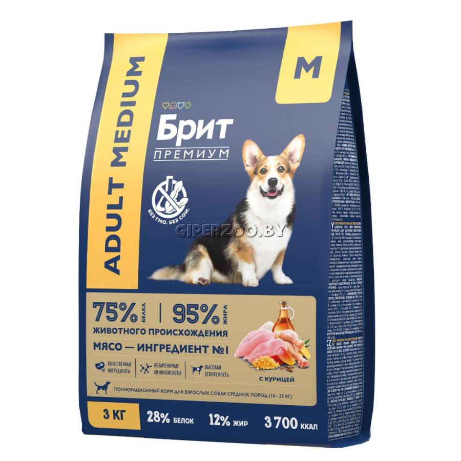 Брит Премиум Сухой корм для взрослых собак средних пород с курицей Dog Adult Medium (Brit Premium) - полнорационный сухой корм премиум класса с высоким содержанием мяса 30%, в том числе мясо курицы 14%. Состав идеально сбалансирован и отвечает всем потребностям в зависимости от возраста и породы. Содержание незаменимых аминокислот способствуют здоровому гармоничному развитию.