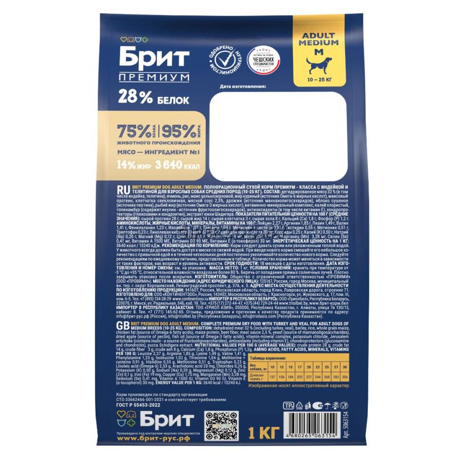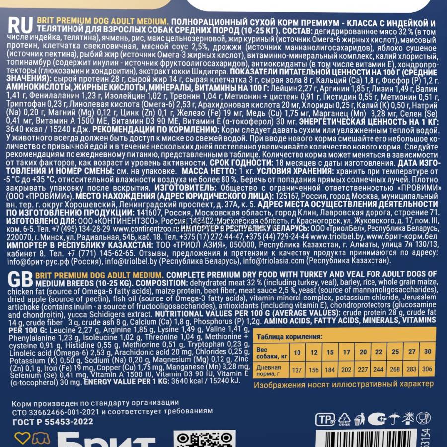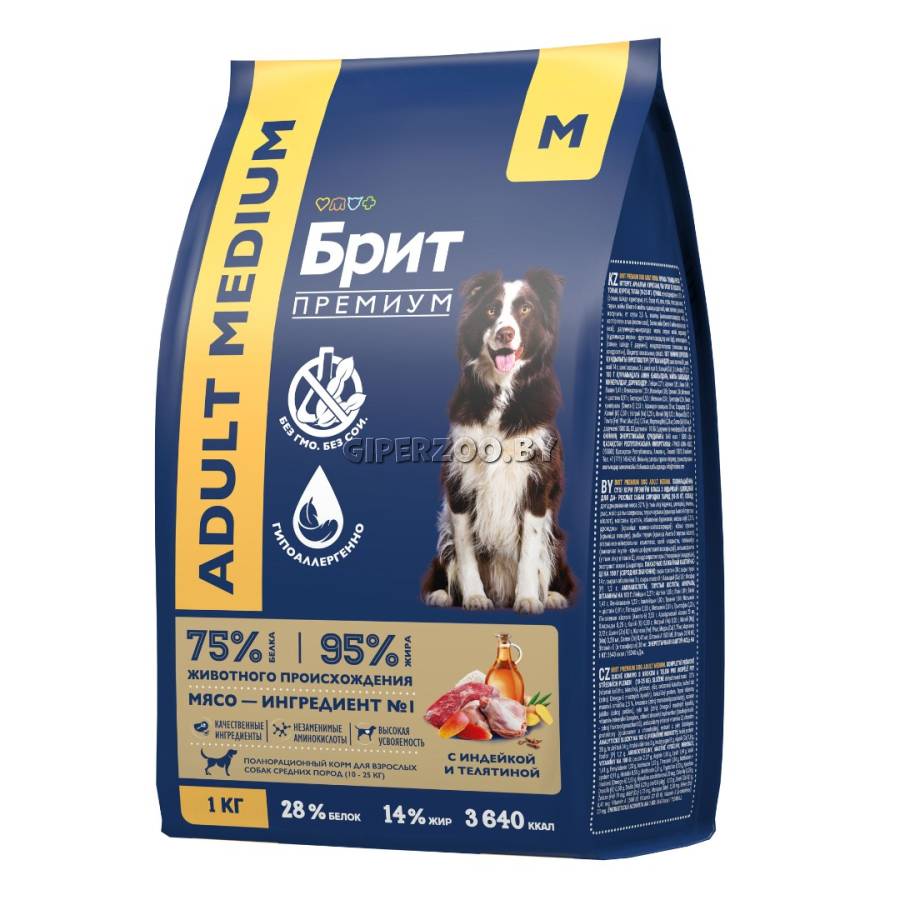 Брит Премиум Сухой корм для взрослых собак с индейкой и телятиной Dog Adult Medium (Brit Premium) – полнорационный сухой корм премиум-класса для собак средних пород (10–25 кг).