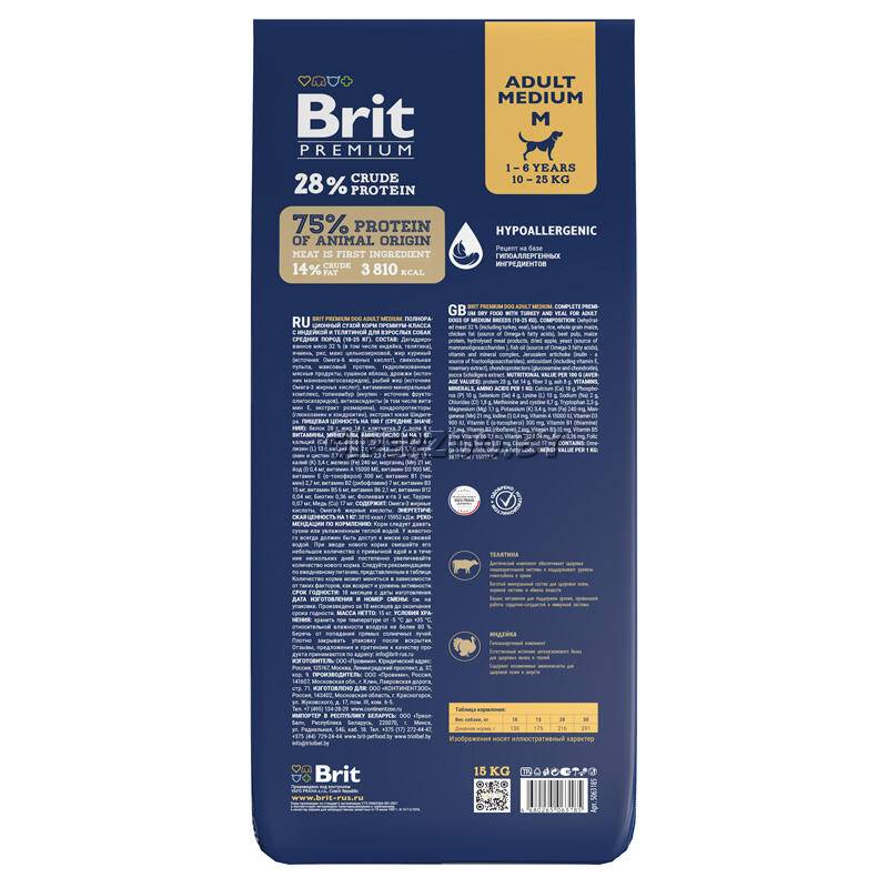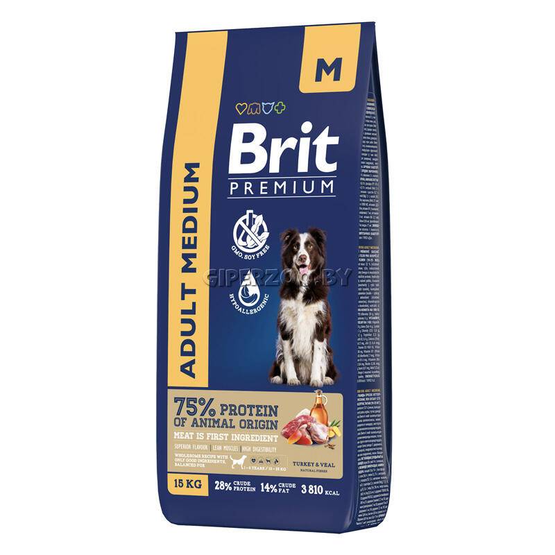 Brit Premium Dog Adult Medium. Полнорационный сухой корм премиум-класса с индейкой и телятиной для взрослых собак средних пород (10-25 кг)