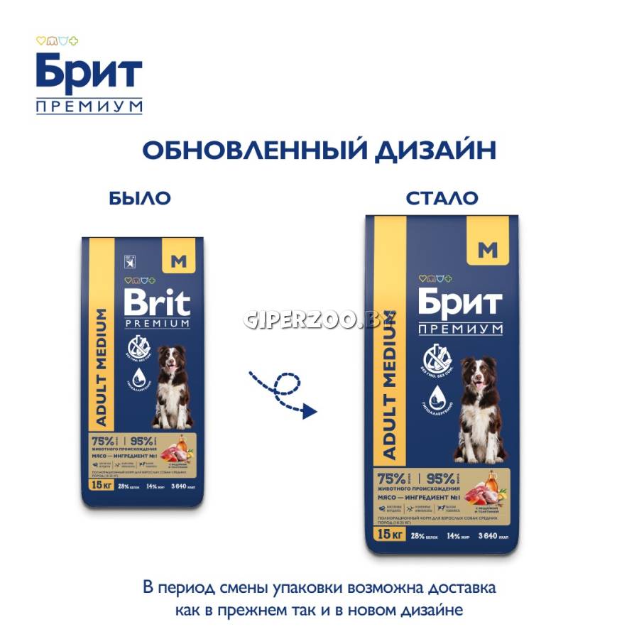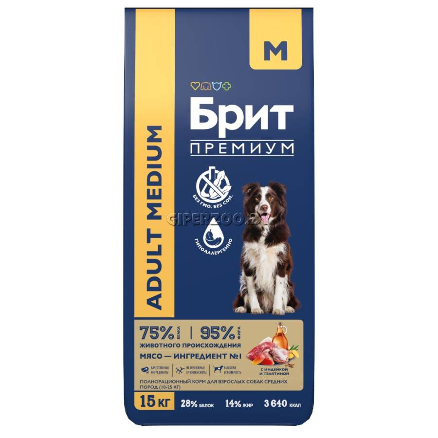 Брит Премиум Сухой корм для взрослых собак с индейкой и телятиной Dog Adult Medium (Brit Premium) – полнорационный сухой корм премиум-класса для собак средних пород (10–25 кг).
