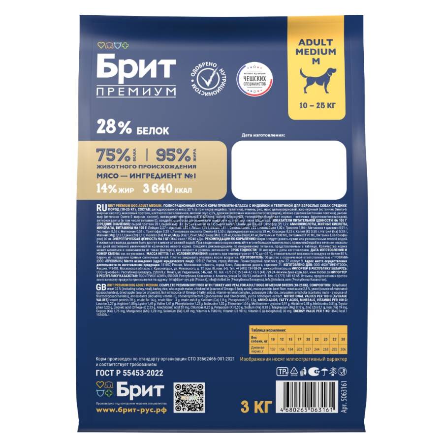 Брит Премиум Сухой корм для взрослых собак с индейкой и телятиной Dog Adult Medium (Brit Premium) – полнорационный сухой корм премиум-класса для собак средних пород (10–25 кг).