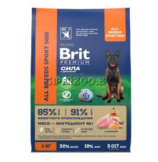Brit Premium Dog Sport 5000 (Курица) — полнорационный корм с высоким содержанием энергии Brit Premium Sport 5000 для взрослых собак всех пород, подверженных затяжным и повышенным физическим нагрузкам. Работа служебных и спортивных собак сопровождается высоким уровнем напряжения и интенсивной физической нагрузкой, поэтому их рацион должен учитывать специальные потребности в питательных веществах: Повышенное количество жира; Доступный белок — для быстрого восстановления мышечной ткани; Противовоспалительные компоненты — для защиты опорно-двигательного аппарата; Рис — для более быстрого восполнения баланса глюкозы в организме; Повышенное количество электролитов — для передачи энергии, поддержания водного баланса и обеспечения процессов дыхания клеток; L- карнитин — для стимуляции гликогенеза (производства глюкозы из жира). Brit Premium Sport 5000 подходит для: занятий спортом; поисково-спасательных работ; буксировки, работы в упряжке; охранной деятельности; пастушьей деятельности; содержания в открытых вольерах